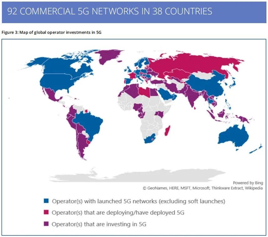 其中,38 个国家和地区的 92 家运营商已经推出了一项或多项符合 3GPP 标准的 5G 服务。84 家运营商已经推出了符合 3GPP 标准的 5G 移动服务。37 家运营商已经推出了符合 3GPP 标准的 5G FWA 或家庭宽带服务。9 家运营商宣布推出了有限可用的 5G 服务或者试商用服务,这些都没有统计在上述商用网络数字中。