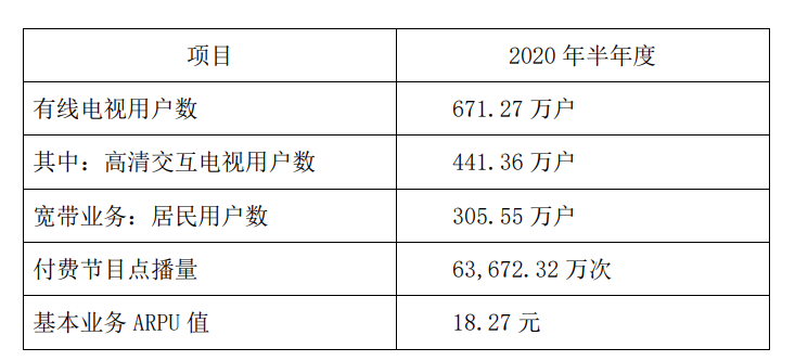 经营数据显示,广西广电有线电视用户数 671.27 万户,相比上一季度增长57.7万户;高清交互电视用户数 441.36 万户,相比上一季度恩工作55.7万户;宽带业务居民用户数 305.55 万户,相比上一季度增长7.8万户;付费节目点播量 63,672.32 万次基本业务 ARPU 值 18.27 元。